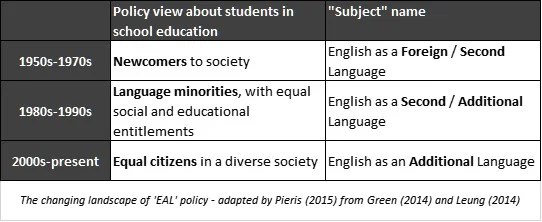 The "subject" name developments shown could suggest a move towards welcoming and integrating students within school societies, away from considering them as 'foreign' 'newcomers', who do not belong in mainstream classrooms. The shift to "Additional" language could also be an acknowledgement of the multilingualism or plurilingualism of many EAL learners, as well as the value of their languages other than English.