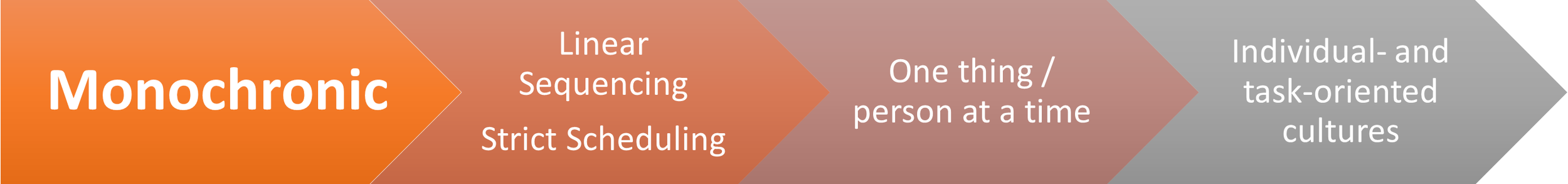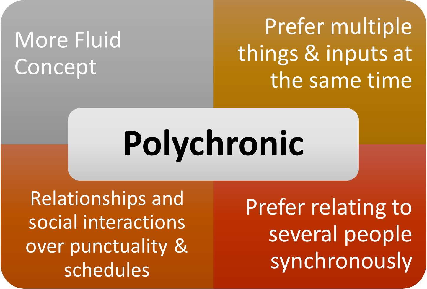 For example, monochronic cultures favour doing one thing at a time and adhere more strictly to deadlines and schedules, whilst polychronic cultures view deadlines as things which are more like flexible ideals, and prefer doing many things at once.